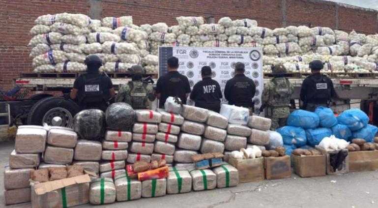 El tractocamión en el que iban Eli «V» y Jorge «G», llevaba costales de cebollas, pero entre los mismos iban paquetes con diversas drogas.