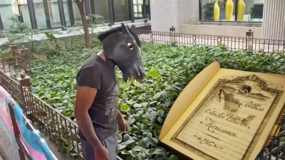 Por otra parte, el Therian acompañó al abogado que presentó el escrito y durante el evento portó una máscara de caballo, simuló relinchar y hasta comer plantas.