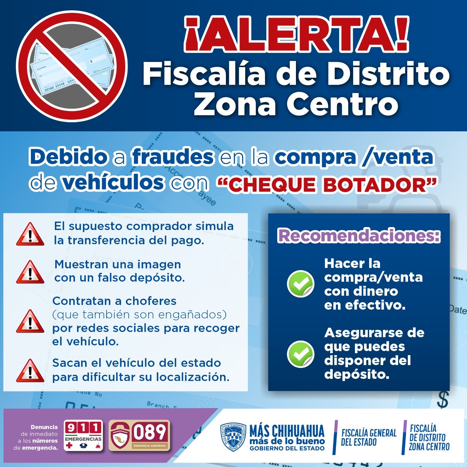 La Fiscalía de Distrito Zona Centro advirtió sobre el incremento de una modalidad de fraude en la compra/venta de vehículos, en donde se utiliza una figura denominada “cheque botador”.