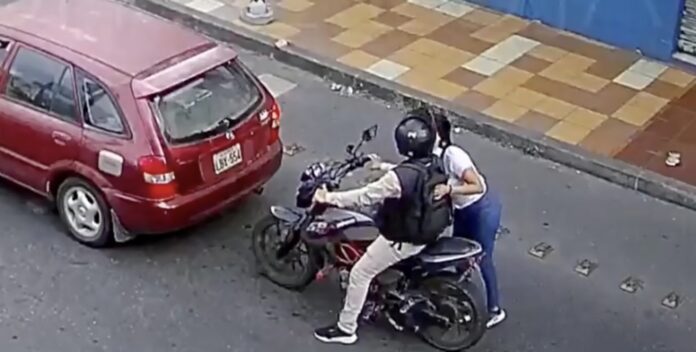 En las imágenes se observa el momento exacto en que un motociclista se detiene en un semáforo para dejar a su esposa. Tras una breve despedida, el hombre avanza confiado al tener la luz verde a su favor.