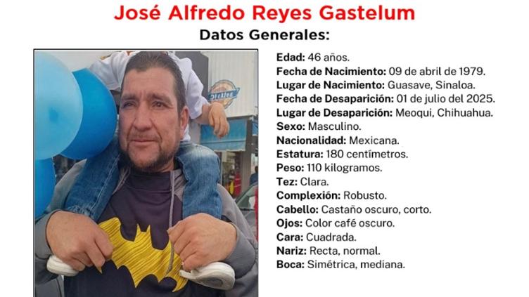 La Fiscalía solicita ayuda para encontrar al sonorense José Alfredo Reyes Gastelum de 46 años, quien desapareció el 1 de julio del presente año en Meoqui. Por ahora se desconoce su paradero.