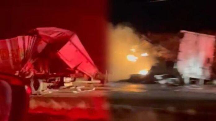 Las autoridades informaron que el reporte fue recibido durante la noche, alertando sobre llamas de varios metros de altura que envolvían a uno de los tractocamiones tras el fuerte impacto por alcance.