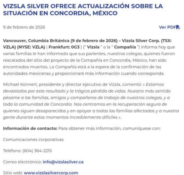 “Estamos devastados por este resultado y la trágica pérdida de vidas. Nuestro más sentido pésame a las familias, amigos y compañeros de trabajo de nuestros colegas, así como a toda la comunidad de Concordia”, expresó Michael Konnert, presidente y director ejecutivo de Vizsla Silver Corp., quien añadió que la empresa se mantiene enfocada en la localización de las personas que aún continúan desaparecidas y en brindar apoyo a las familias afectadas.