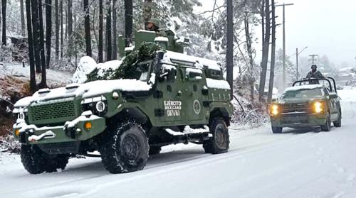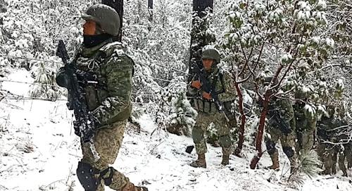 A través de redes sociales, la dependencia difundió fotografías de los operativos tácticos en los que se observa a los elementos militares efectuando patrullajes en zonas cubiertas de nieve y bajo condiciones climáticas adversas.