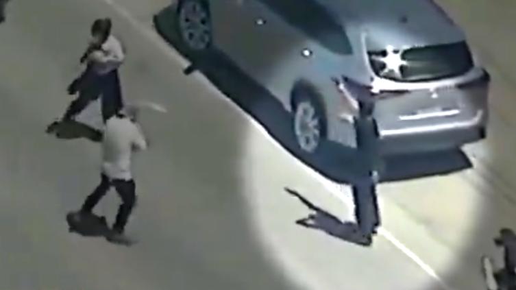 Primero se aleja de los elementos del ICE y cuando está al lado de una camioneta apunta con el arma y parece realizar detonaciones.