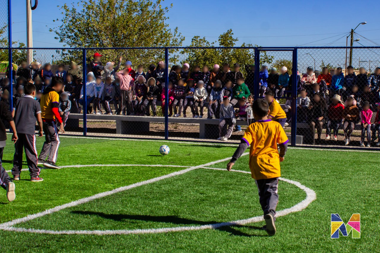 Meoqui.- La alcaldesa Miriam Soto realizó la entrega de una cancha de futbol rápido con gradas y malla perimetral en la Escuela Primaria Sector Obrero, con una inversión cercana de un millón de pesos, misma que fue elegida por parte de la ciudadanía en general en el ejercicio del Presupuesto Participativo 2025, obra que fomenta el deporte y la convivencia entre la niñez meoquense.