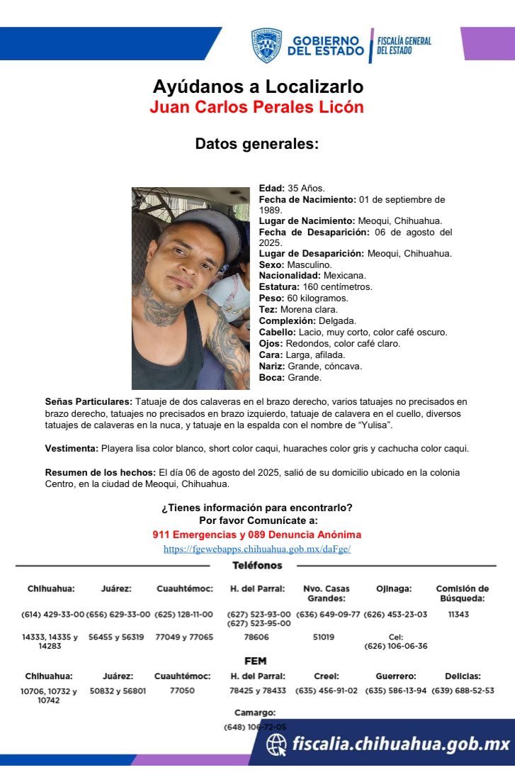 La Fiscalía General del Estado emitió una alerta para localizar a Juan Carlos Perales Licón, un hombre de 35 años que desapareció el pasado 6 de agosto del 2025 en la ciudad de Meoqui, Chihuahua, nació en septiembre de 1989 y es originario de dicha localidad, es de complexión delgada, mide aproximadamente 1.60 metros, pesa 60 kilogramos y tiene tez morena clara.