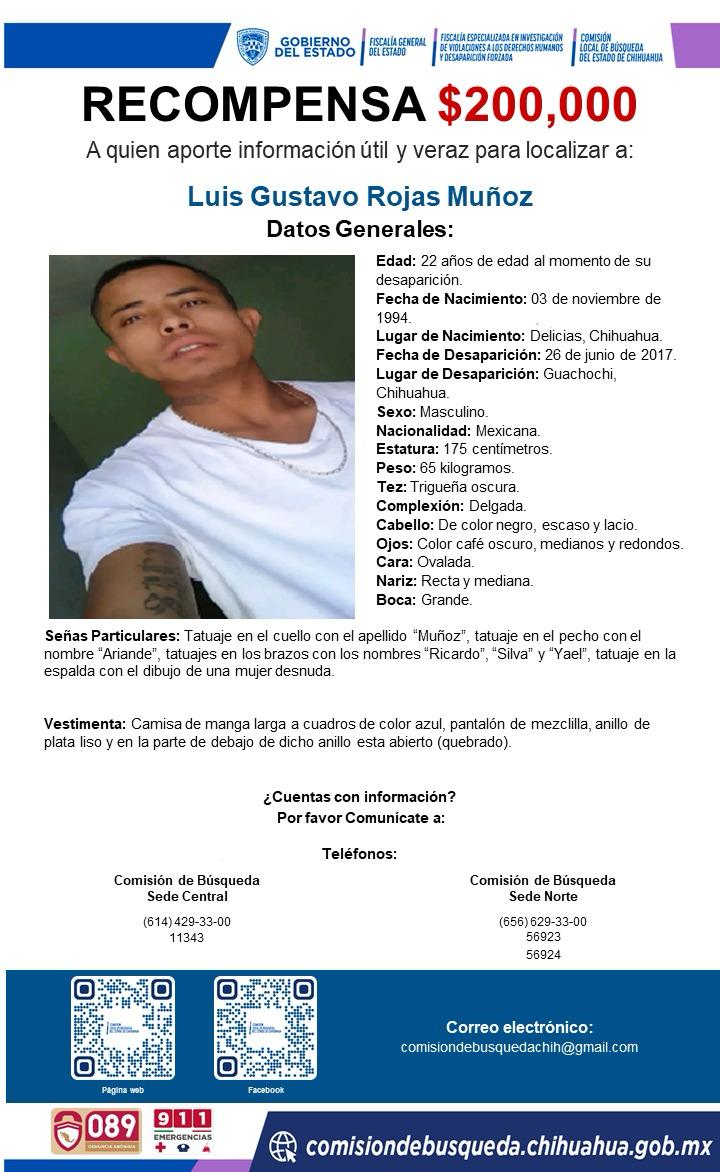 En cuanto a Luis Gustavo Rojas Muñoz, nació el 3 de noviembre de 1994 en Delicias, Chihuahua, mide 1.75 metros, pesa 65 kilogramos, es de tez trigueña oscura, complexión delgada, cabello negro, escaso y lacio, ojos café oscuro, medianos y redondos, cara ovalada, nariz recta y mediana y boca grande.