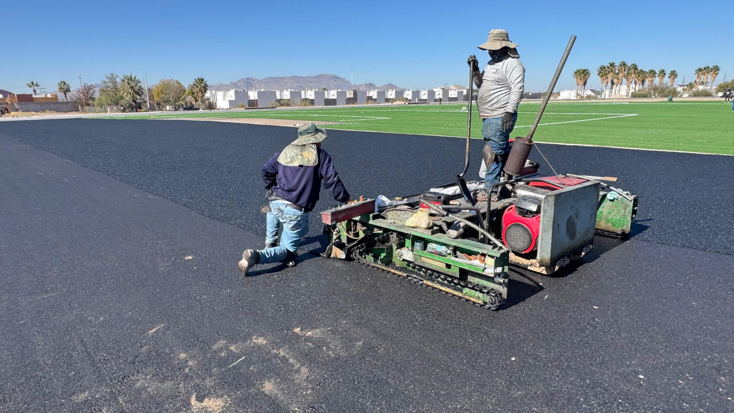 El funcionario explicó que esta etapa contempla un proceso técnico que incluye la aplicación de un químico base, seguido de una capa de material tipo caucho y posteriormente una capa final de protección y color, que conforma la superficie definitiva de la pista.
