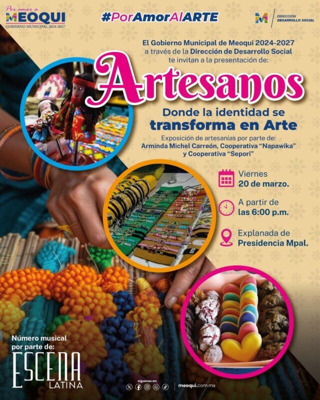 Meoqui..- En el marco del programa “Por Amor al Arte”, el Gobierno Municipal de Meoqui, a través de la Dirección de Desarrollo Social, invita a la ciudadanía a la exposición “Artesanos, donde la identidad se transforma en Arte”, la cual se llevará a cabo este viernes 20 de marzo a partir de las 6:00 de la tarde en la explanada de la Presidencia Municipal.