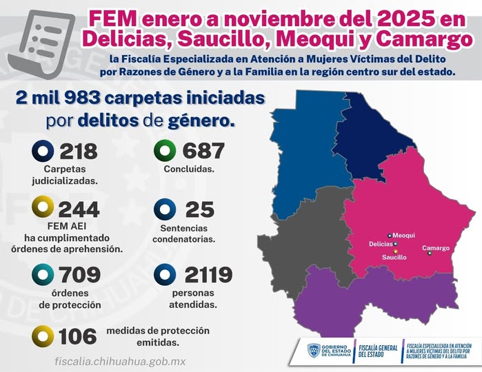 En ese periodo se iniciaron 2,983 carpetas de investigación, de las cuales 474 corresponden al municipio de Camargo, 1,728 a Delicias, 613 a Meoqui y 168 a Saucillo.