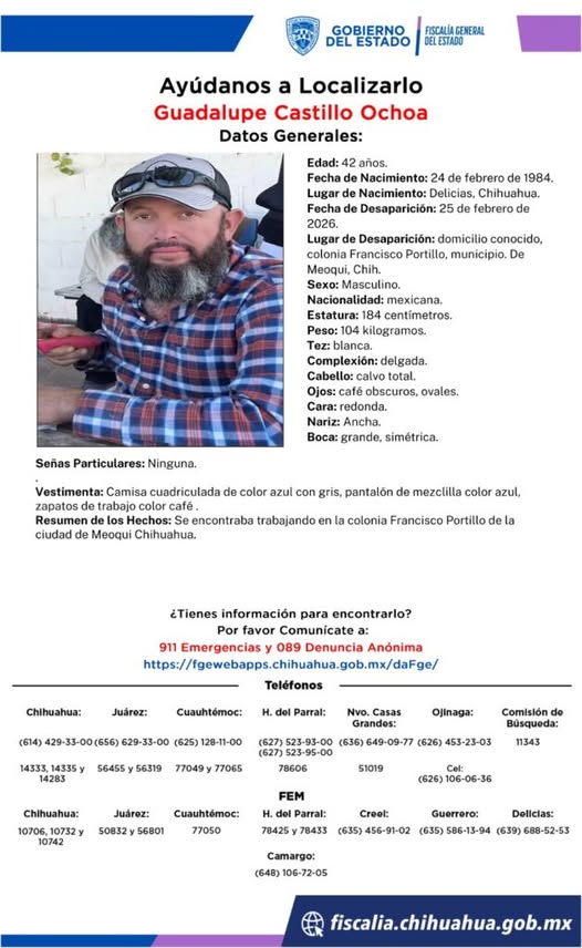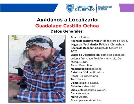 La Fiscalía General del Estado emitió una pesquisa para localizar a Guadalupe Castillo Ochoa, de 42 años de edad, quien fue reportado como desaparecido el pasado este miércoles en el municipio de Meoqui.