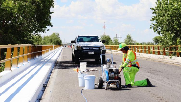 El Centro de la Secretaría de Infraestructura, Comunicaciones y Transportes (SICT) en el estado pintó el puente San Pedro, como parte de la rehabilitación de la carretera Chihuahua a Delicias.
