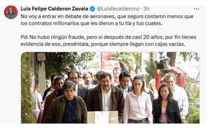 «No voy a entrar en debate de aeronaves, que seguro costaron menos que los contratos millonarios que les dieron a tu tía y tus cuates. Pd: No hubo ningún fraude, pero si después de casi 20 años, por fin tienes evidencia de eso, preséntala, porque siempre llegan con cajas vacías», escribió el hijo de Calderón.