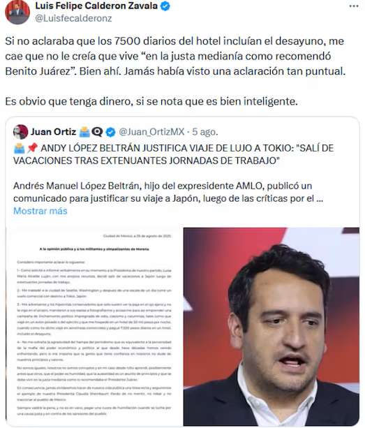 La discusión inició cuando Calderón Zavala criticó a «Andy» López Beltrán por sus vacaciones en Japón: