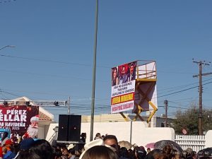 Con el grito de «Fuera Morena» «fuera traidores» fuera chapulines», los manifestantes mantenían su protesta apoyados con lonas, una de ellas en contra de la senadora Andrea Chávez, en contra del exgobernador panista, hoy senador de Morena, Javier Corral Jurado y contra el actual alcalde de Ciudad Juárez, Cruz Pérez Cuéllar, a quien se le atribuye la posada organizada por los llamados «Amigos de Cruz» y por militantes de Morena, muchos de ellos ataviados con su tradicional chaleco guinda.