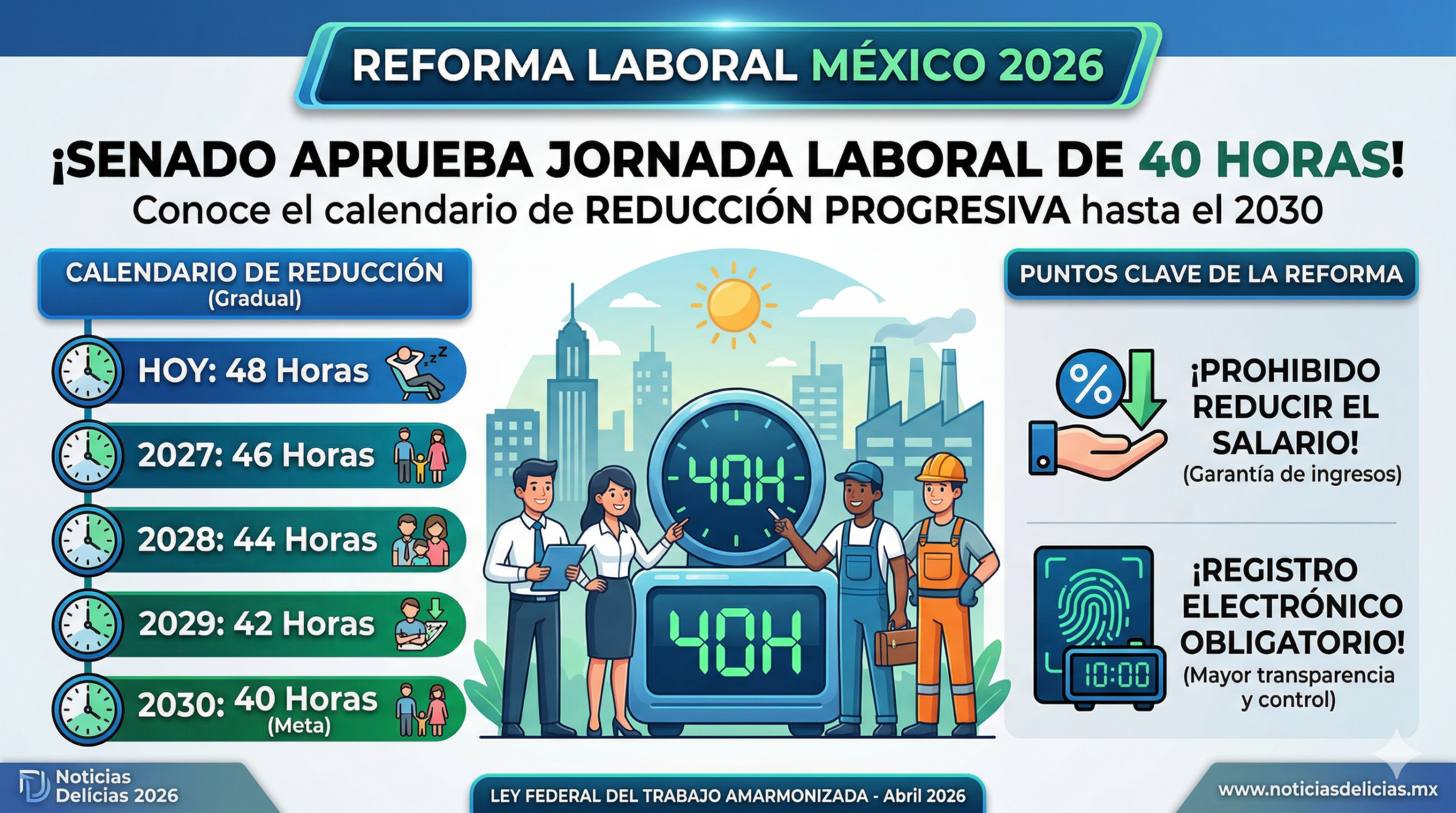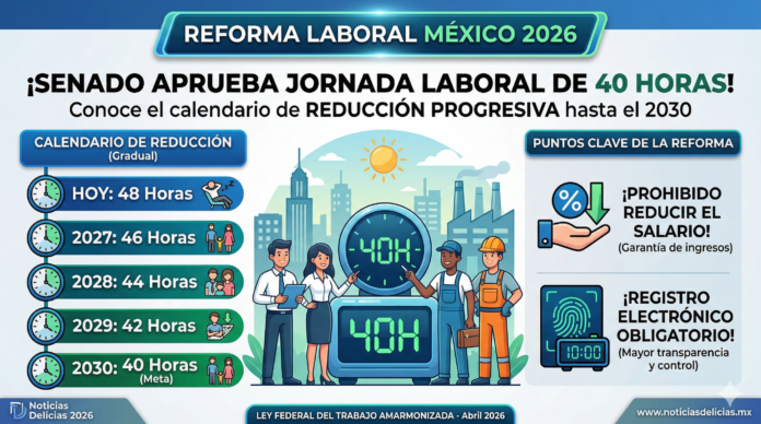 CIUDAD DE MÉXICO. — En una sesión histórica este 8 de abril de 2026, el Pleno de la Cámara de Senadores aprobó por unanimidad de 104 votos los cambios a la Ley Federal del Trabajo (LFT) para implementar la jornada laboral de 40 horas en México. Esta reforma, que busca armonizar la legislación nacional con los estándares internacionales de la OIT, introduce un esquema de reducción progresiva que culminará en 2030, además de imponer la obligación tecnológica de que todos los empleadores registren las jornadas de sus trabajadores de forma electrónica para evitar abusos y horas extra no pagadas.