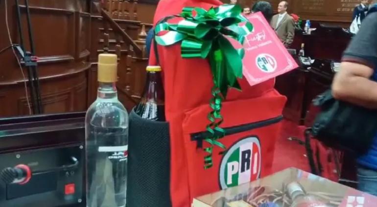 Las mochilas, de color rojo y con el logotipo del PRI al frente, incluían una caguama colocada en un costado y una tarjeta de felicitación, además de un moño decorativo en color verde.