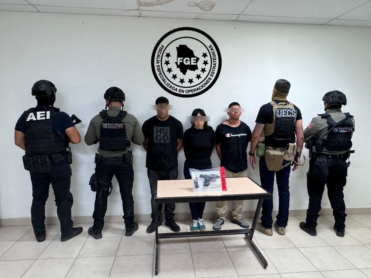Durante la intervención, a uno de los masculinos se le aseguró un arma de fuego tipo pistola calibre .40, con 12 cartuchos útiles, quien de manera voluntaria proporcionó información del domicilio donde mantenían a la víctima. Los detenidos fueron identificados como Luz Sarai “N” de 36 años, Erick Francisco “N” de 33 años y Erick “N” de 30 años.
