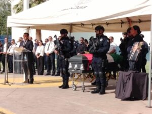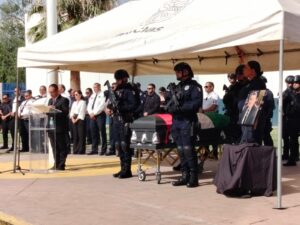El homenaje inició en la funeraria Fátima, donde elementos del Ejército Mexicano se hicieron presentes para brindar honores militares al comandante caído, ya que además de su trayectoria como jefe policiaco, Jorge Luis Bustamante también perteneció a las filas castrenses, lo que dio un marco aún más emotivo a la ceremonia de despedida, en la que se escucharon palabras de reconocimiento y se montó una guardia de honor en su memoria.