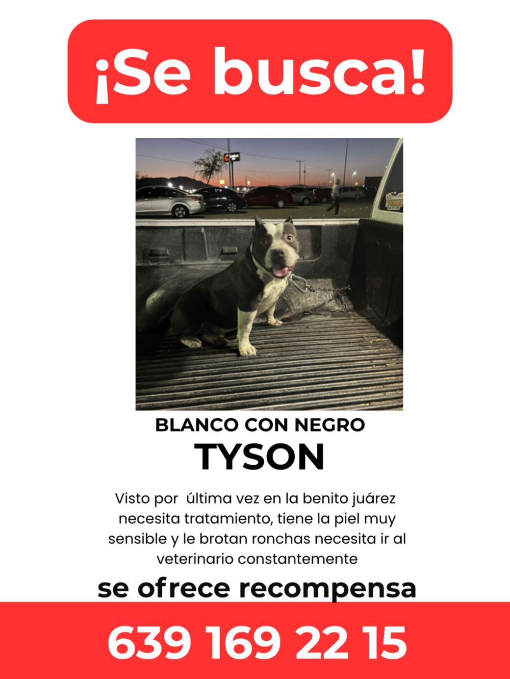 La colonia Benito Juárez se encuentra en alerta tras la pérdida de un canino llamado Tyson, un perro de color blanco con negro que fue visto por última vez en la zona y según informaron los propietarios, necesita tratamiento médico constante debido a su piel sensible, que le provoca brotes de manchas y ronchas.