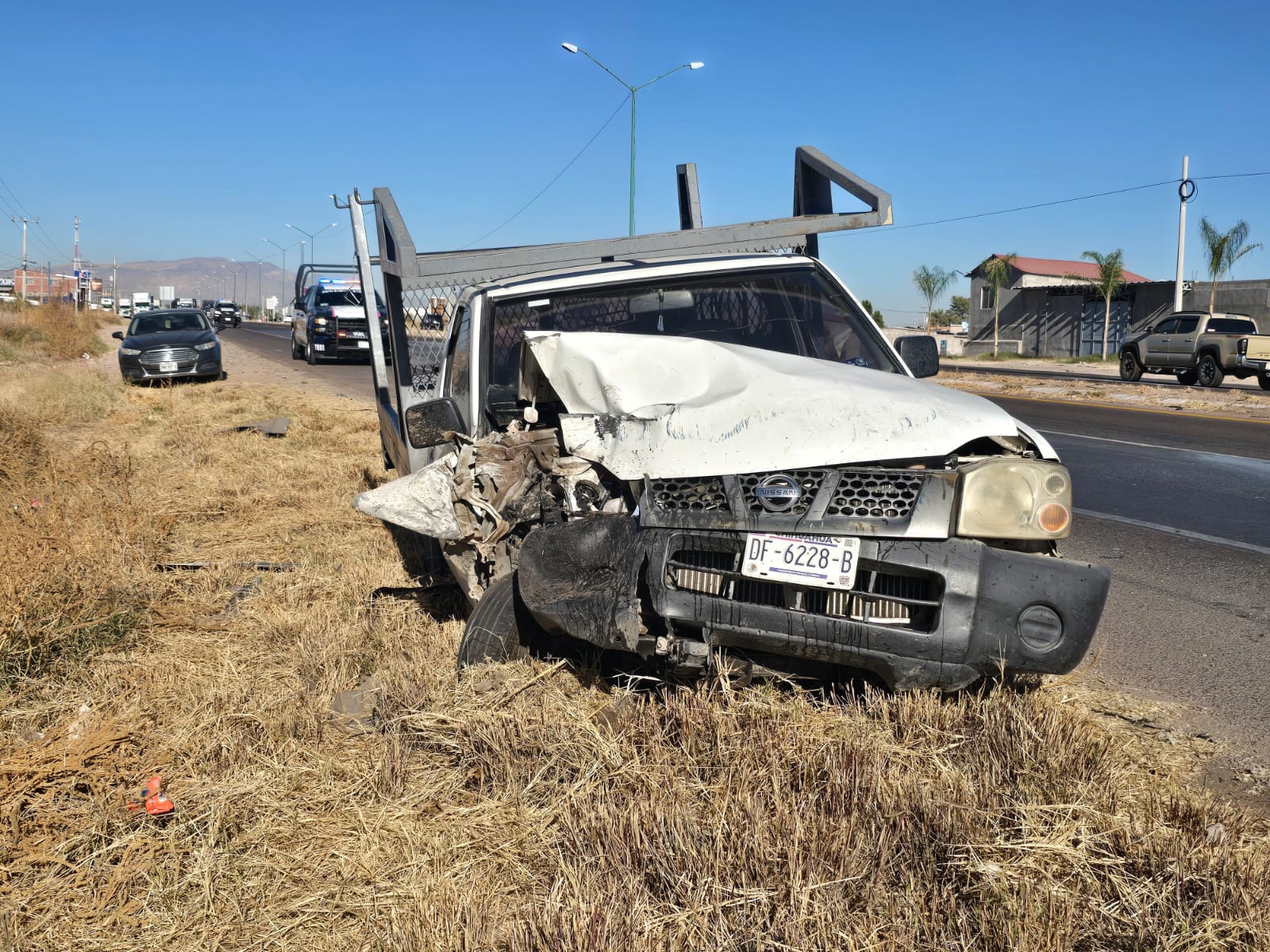 Meoqui.- Tras bloquearse el volante al momento de realizar una maniobra de rebase sobre la carretera federal número 45, un vehículo de la marca Nissan perdió el control de la dirección y se impactó contra la parte posterior lateral izquierda de una camioneta cerrada de la marca Chrysler, lo que generó daños de consideración.