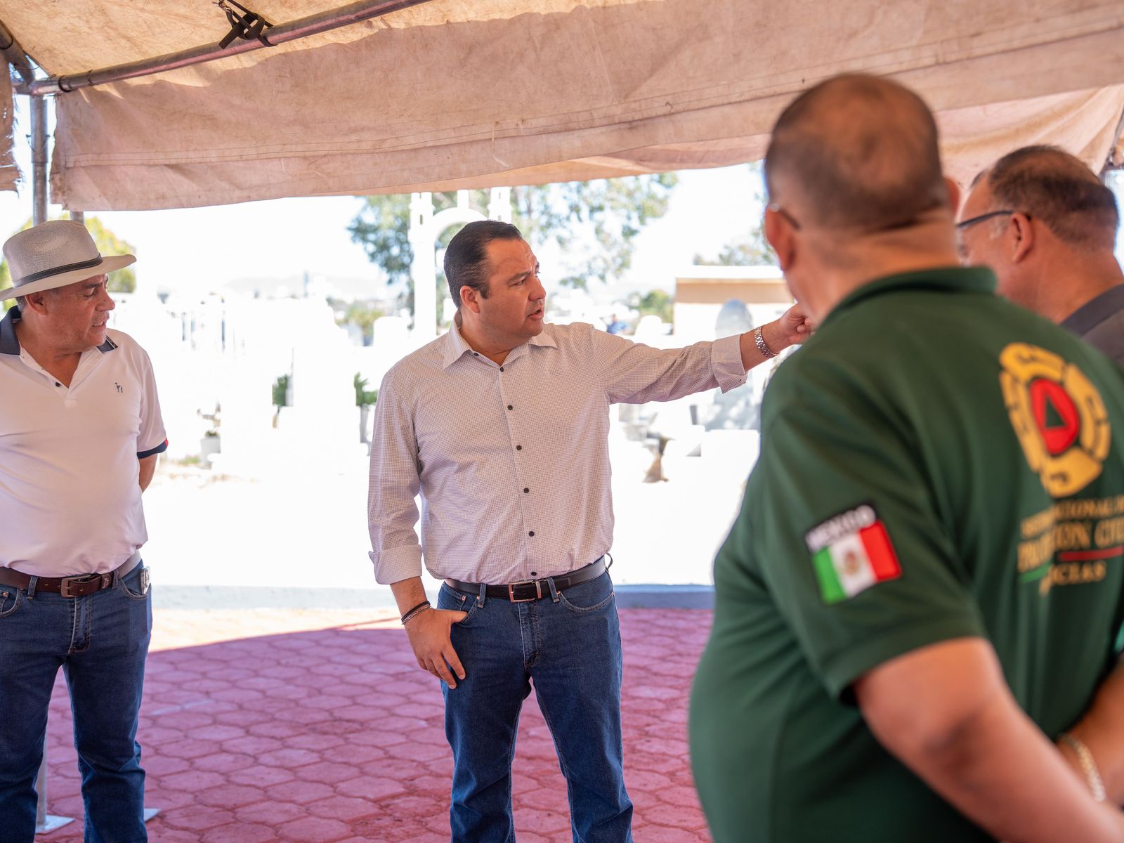 Acompañado por Patricio Barrera Juárez, Carlos Rodríguez y Gilberto Terrazas, coordinador de Protección Civil, director de Servicios Públicos y coordinador de Seguridad Pública, respectivamente, el alcalde verificó personalmente que el área estuviera limpia, las piletas de agua funcionando y que los cuerpos de emergencia estuvieran distribuidos estratégicamente. Destacó que en los diferentes panteones hay 40 elementos de Seguridad Pública y 20 de Vialidad, además de 20 paramédicos y cuatro ambulancias, así como personal del Departamento de Bomberos, todos listos para atender cualquier eventualidad.