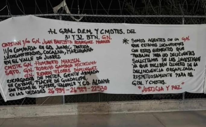 La lona acusa a los mandos señalados de supuestamente facilitar el tráfico de cargas de droga y personas migrantes, además de permitir el libre paso de personas armadas por la región del Valle de Juárez.