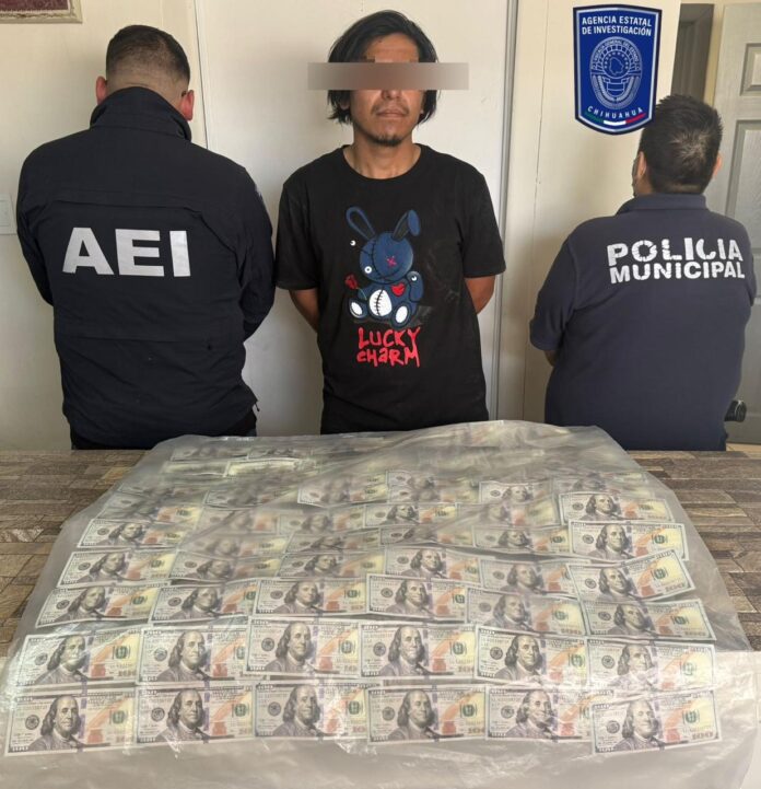 Ciudad Juárez.- Elementos de la Agencia Estatal de Investigación (AEI), adscritos a la Fiscalía de Distrito Zona Norte, detuvieron en flagrancia a quien se identificó como Jesús Leonel A. P., luego de que se le encontró en posesión de 20 mil 800 dólares falsos en el municipio de Ahumada.