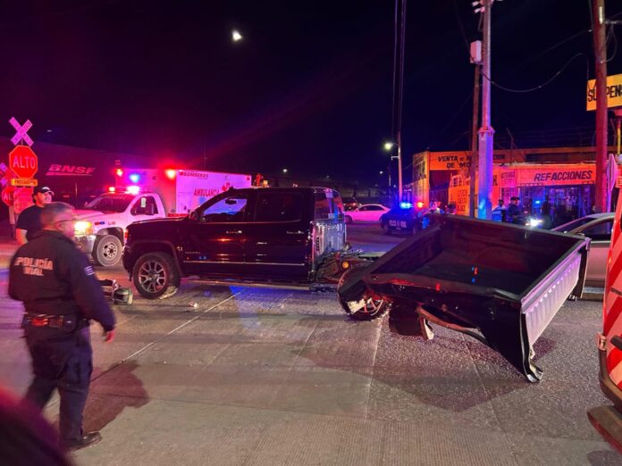 Meoqui.- Un aparatoso choque contra el tren en Meoqui, dejo está noche de viernes y madrugada del sábado, daños materiales de consideración en al menos dos vehículos, entre ellos una pick up que según testigos, intentó ganarle el paso al ferrocarril, sin embargo fue embestida por la máquina, impactando a otro auto tras ser proyectada.